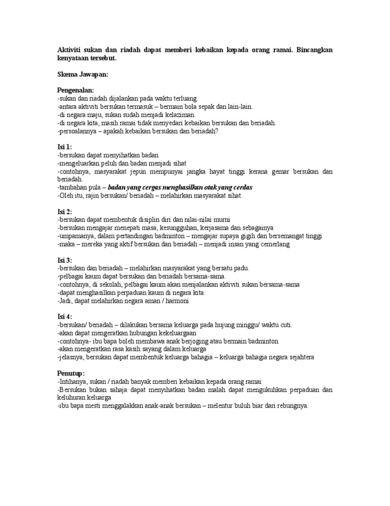 Kerajaan mewajibkan program sukan disertai oleh semua pelajar di sekolah. Contoh Karangan Bahasa Malaysia. Kerajaan telah menetapkan 10 peratus markah kokurikulum sebagai syarat.