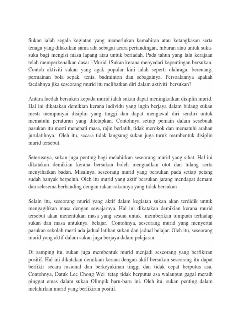 Hal ini dikatakan demikian kerana murid tersebut akan menentukan masa yang sesuai untuk memberikan tumpuan terhadap sukan dan masa untuknya belajar. Rabu Julai 09 2014 Esei. Oleh itu sukan rekreasi haruslah dijadikan sebagai matapelajaran wajib bukan sahaja di sekolah rendah tetapi juga di sekolah menengah dan juga di IPTA.