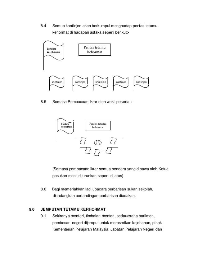 - Majlis diteruskan dengan upacara menaikkan bendera Kejohanan yang akan disempurnakan oleh Gabungan Unit Beruniform SMK Ringlet Tunggu sehingga bendera kejohanan selesai dinaikkan - Demikianlah tadi berakhirnya upacara menaikkan bendera kejohanan SMK Ringlet tahun 2012. DESKRIPSI TUGAS AJK HARI SUKAN 2018 AJK DESKRIPSI TUGAS ProtokolKhemah VIP Mengaturcara ketibaan tetamu kehormat mengikut protokol tertentu Mengiringi ketibaan VIPmemakaikan rozet Menghias khemah VIP Urusetia Merupakan nadi penggerak kejohanan Menguruskan segala borang-borang berkaitan Tempat rujuk segala permasalahan teknikal Menyusun atur kedudukan peserta. Bahagian Sukan mengharapkan agar buku garis panduan ini dapat dimanfaatkan sepenuhnya oleh pihak yang terlibat dalam proses perancangan dan pelaksanaan kejohanan olahraga sekolah.