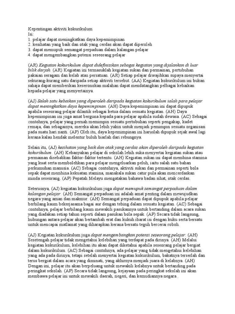 Contoh karangan faedah menyertai aktiviti kokurikulum calon lemah sederhana penglibatan dalam aktiviti kokurikulum memberikan banyak faedah kepada murid. Isu tentang penyertaan pelajar dalam aktiviti kokurikulum yang semakin kurang memberangsangkan menjadi buah mulut banyak pihak. Sukan ialah segala kegiatan yang memerlukan kemahiran atau ketangkasan serta tenaga yang dilakukan sama ada sebagai acara pertandingan hiburan atau untuk mengisi masa lapang dan beriadah.